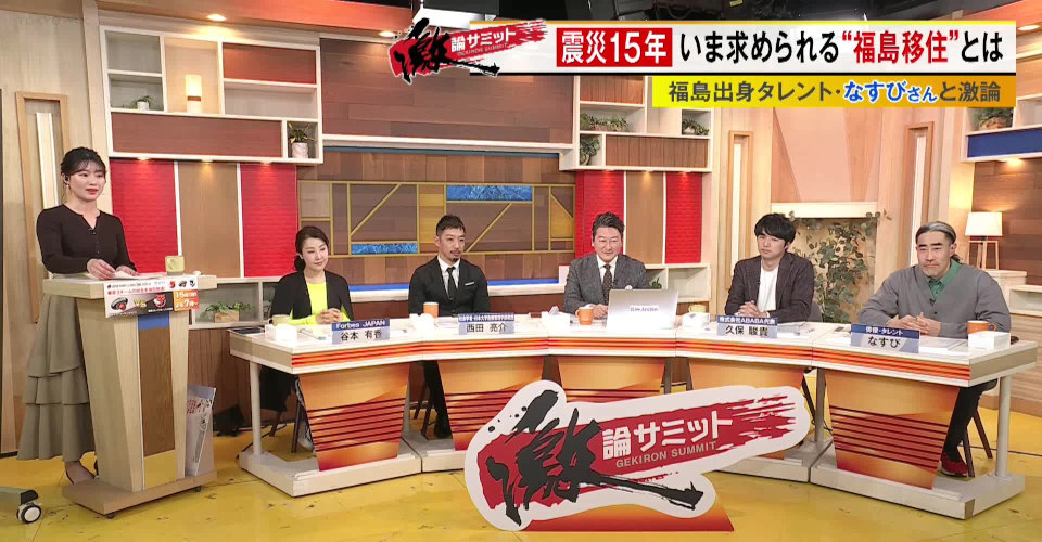 番組では前半に引き続き、Forbes JAPAN Web編集長の谷本有香さん、社会学者・日本大学危機管理学部教授の西田亮介さん、新卒就活サービスを運営する久保駿貴さん、さらには福島県出身で東京との二拠点活動されている俳優・タレントのなすびさんを迎え、福島への移住者をより増やすためにはどうすればいいのか議論しました。