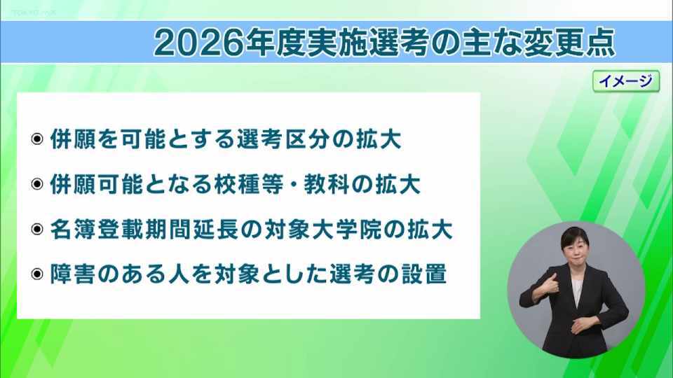 昨年度からの主な変更点は、「併願を可能とする選考区分の拡大」「併願可能となる校種・教科の拡大」「名簿登載期間延長の対象大学院の拡大」「障害のある人を対象とした選考の設置」です。