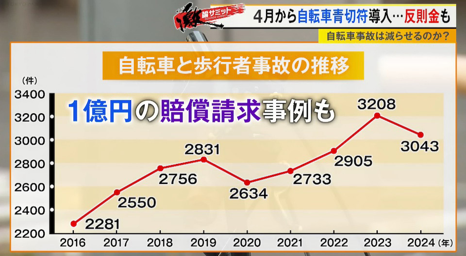 近年、自転車と歩行者による事故は増加傾向にあり、過去には自転車による死亡事故で加害者に1億円近い賠償請求が出た事例もあるなど、深刻な問題となっています。今回の法改正にはそうした事故の抑止を図る狙いがあります。