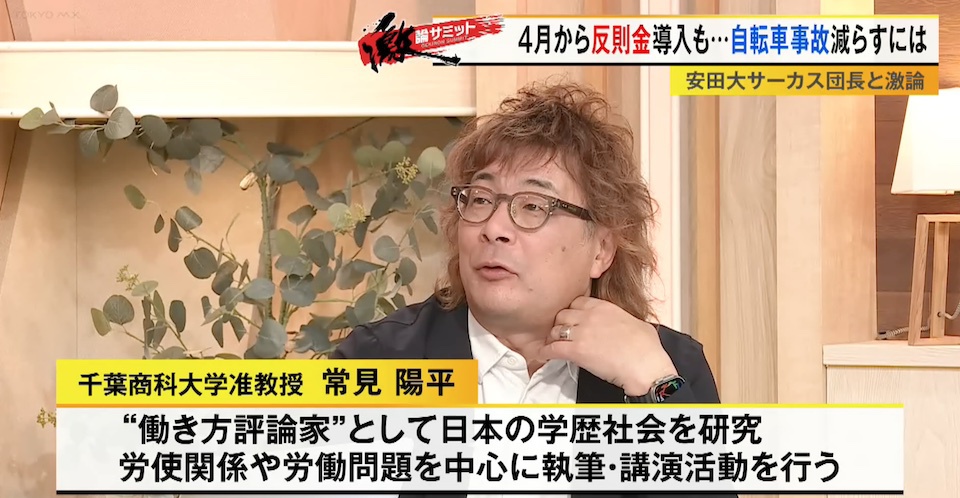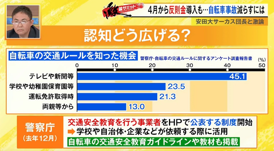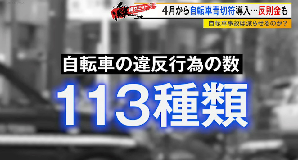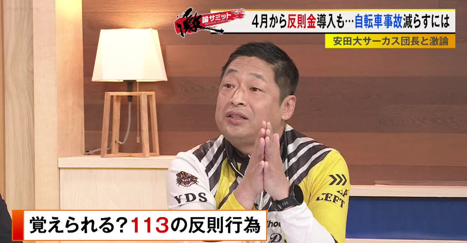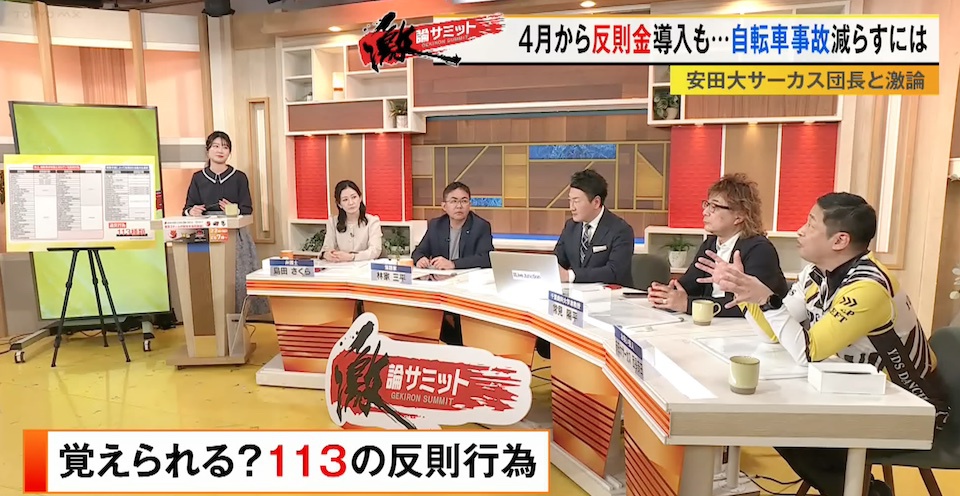 TOKYO MX(地上波9ch)の報道・情報生番組「堀潤激論サミット」(毎週金曜20:57~)。放送では、自転車芸人の安田大サーカス・団長安田さんを迎え、増加傾向にある“自転車事故”を減らす手立てについて徹底議論。番組前半では、4月から施行された改正道路交通法の青切符制度について取り上げました。