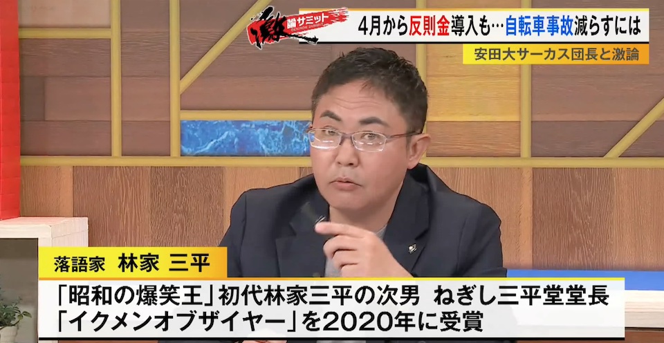 そうした中、自転車事故を減らすためには何が必要なのか。今回は、弁護士の島田さくらさん、落語家の林家三平師匠、千葉商科大学准教授の常見陽平さん、さらには自転車芸人の安田大サーカス・団長安田さんを迎え議論しました。