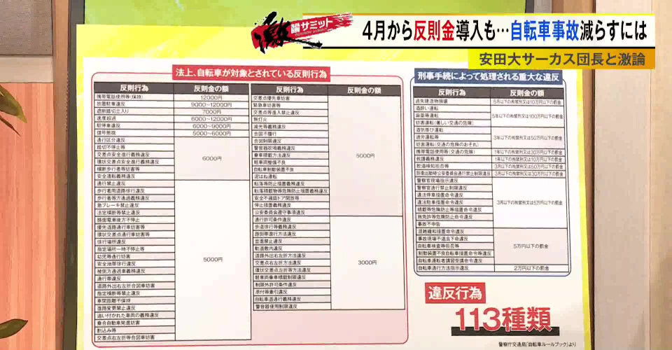 一方、団長安田さんは「(警察庁が示している反則行為が)多すぎる」と指摘。「1個ずつコツコツやっていかないと。まずは逆走をやめさせるとか、ひとつずつフィーチャーした方がいい」と言い、さらには反則金の価格にも言及。高額だと払わない人が出てきたり、16歳以上が対象となるだけに高校生が払える程度の金額にした方がいいのではないかと持論を述べます。